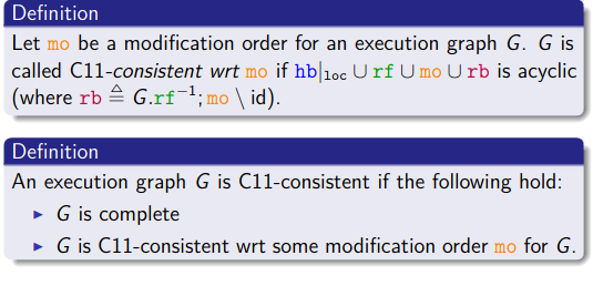 简化模型 在RA的基础上,为变量的访问添加访问模式(access mode): C/C++11中,只计算同步的读写对coherence的贡献: 实际模型 四种访问模式: non-atomic : 默认 relaxed release/acquire sc
