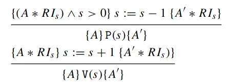 P的条件是s>0,对应不变式中有所有权的析取项;反之V对应没有所有权,并且在当前线程获得10的所有权时需要将其放弃(因为必须重建资源不变式,这由下面的同步原语推导规则规定)