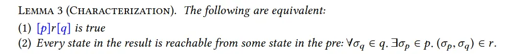 “We can cast the property as stated in terms of something happening by reading a spec backwards: for every state in the result, it is possible to eventually reach a state in the pre by executing backwards.” (O’Hearn, 2020, p. 10)