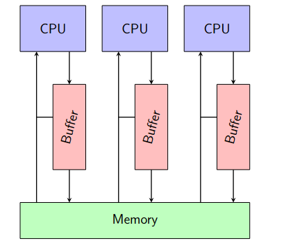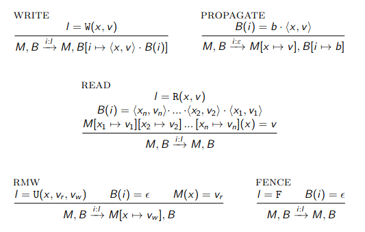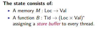 In this case, the memory state is a function from location to value, M, plus a buffer for each thread: