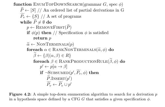 the algorithm prunes the search space by avoiding adding newly expanded programs p0 if p0 is already subsumed by some program that has previously been considered by the algorithm. (This optimization does not greatly reduce the search space in the top-down enumerative strategy because of a limitation that only full derivations can be evaluated for equivalence)