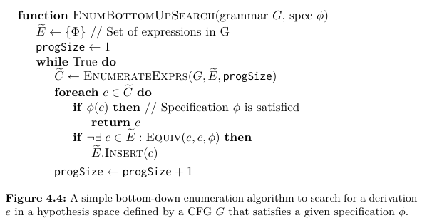 The key idea in this algorithm is to maintain a semantically unique set of expressions E, i.e. no two expressions e and e0 in E are functionally equivalent with respect to the specification φ. (It allows the bottom-up algorithm to significantly decrease the space of expressions.)