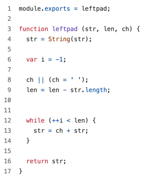 2016年被删除,导致互联网短暂瘫痪十数分钟的npm包,包本身只有十多行代码: