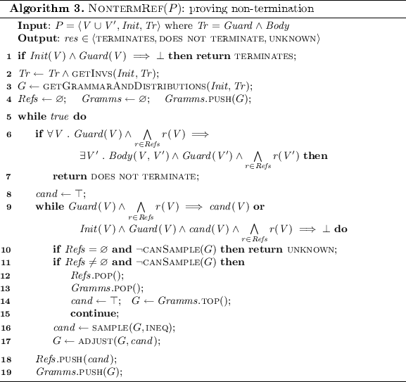 - 对recurrence set,算法从G中迭代地抽取布尔表达式加入循环头(相当于下近似),通过Solver验证是否满足recurrent set的要求。