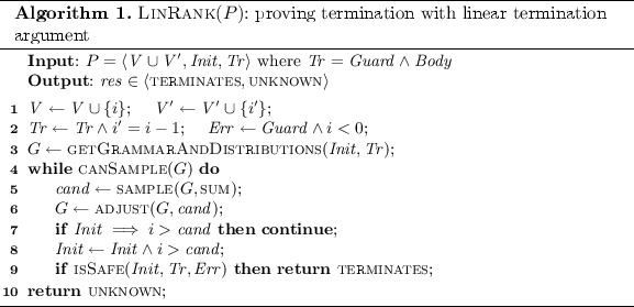 - 对ranking function,算法从G中迭代地抽取线性(应该可以扩展)表达式,作为循环运行的下界,通过Horn Solver求解safe inductive invariant。